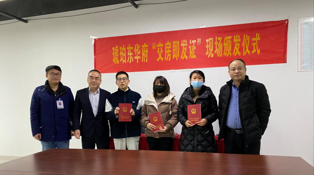 2021年1月21日上午10时,琥珀东华府项目举行了“交房即发证”现场不动产权证书颁发仪式,仪式由公司党委委员、副总经理王庆生主持,合肥市不动产登记中心副主任王国堂、合肥市不动产登记中心瑶海分中心主任韩斗泉等相关部门领导及部分琥珀东华府业主代表参加了此次发证仪式。 会议首先举行了现场颁证仪式,随后,三方就商...